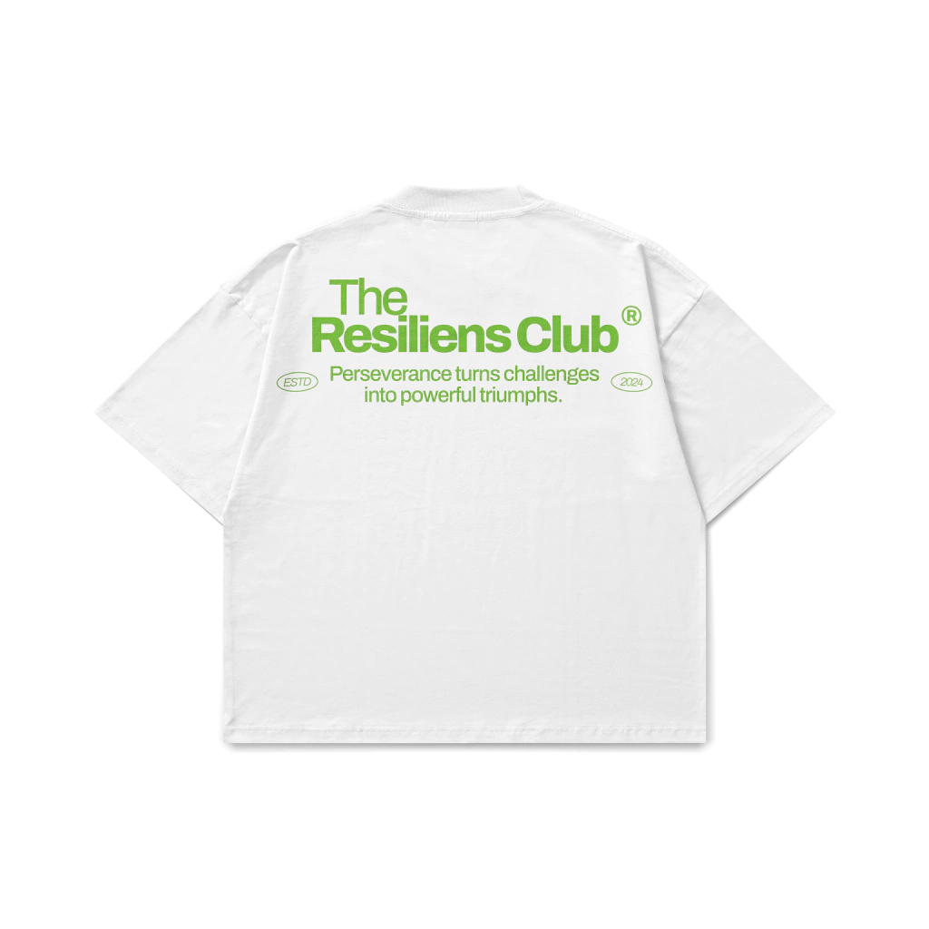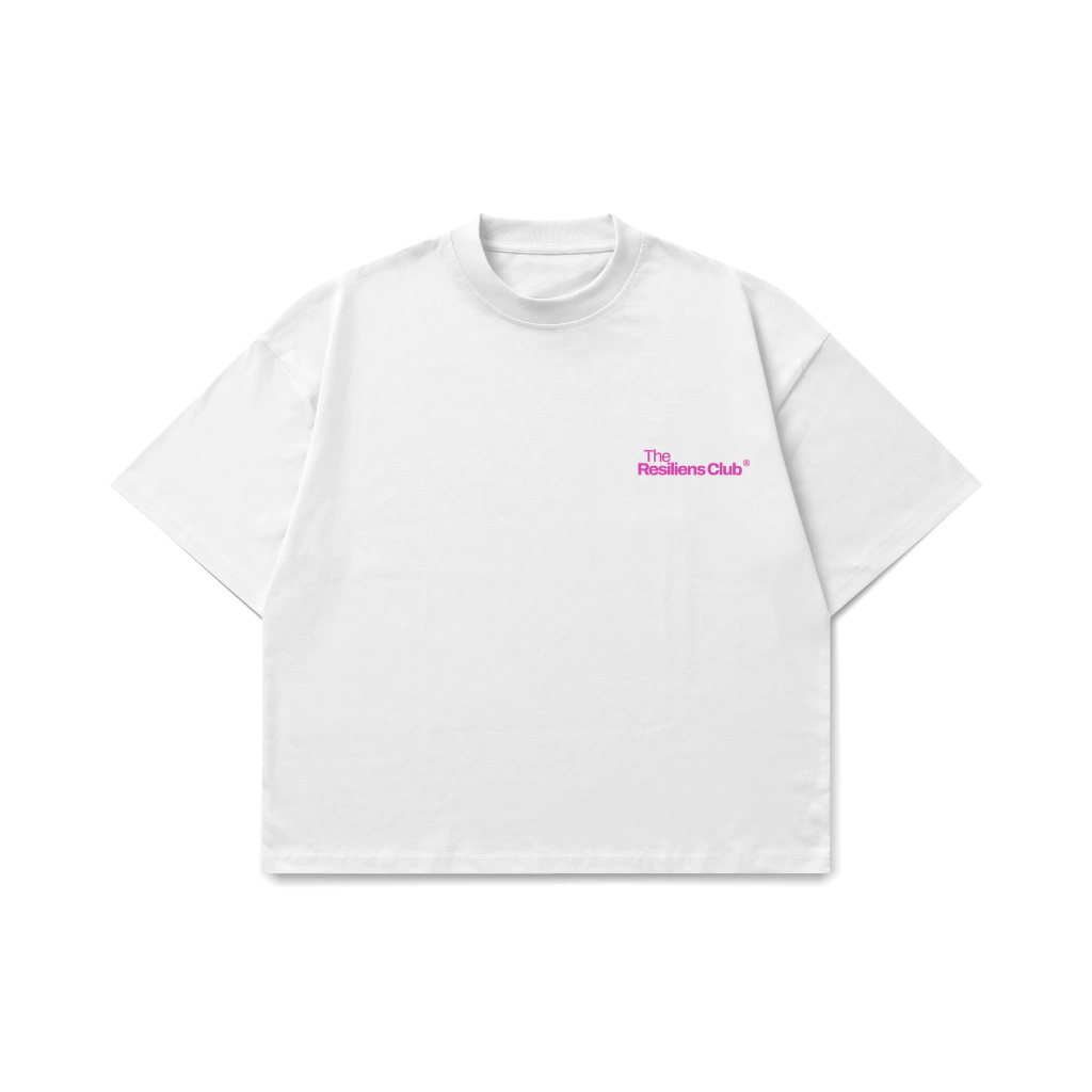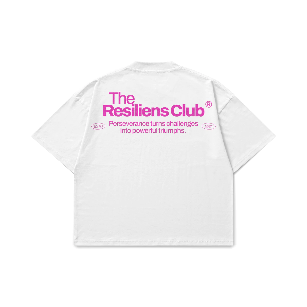 A estampa em rosa vibrante imprime atitude e leveza, enquanto a mensagem no peito carrega o DNA da Resiliens: coragem, consistência e crescimento.